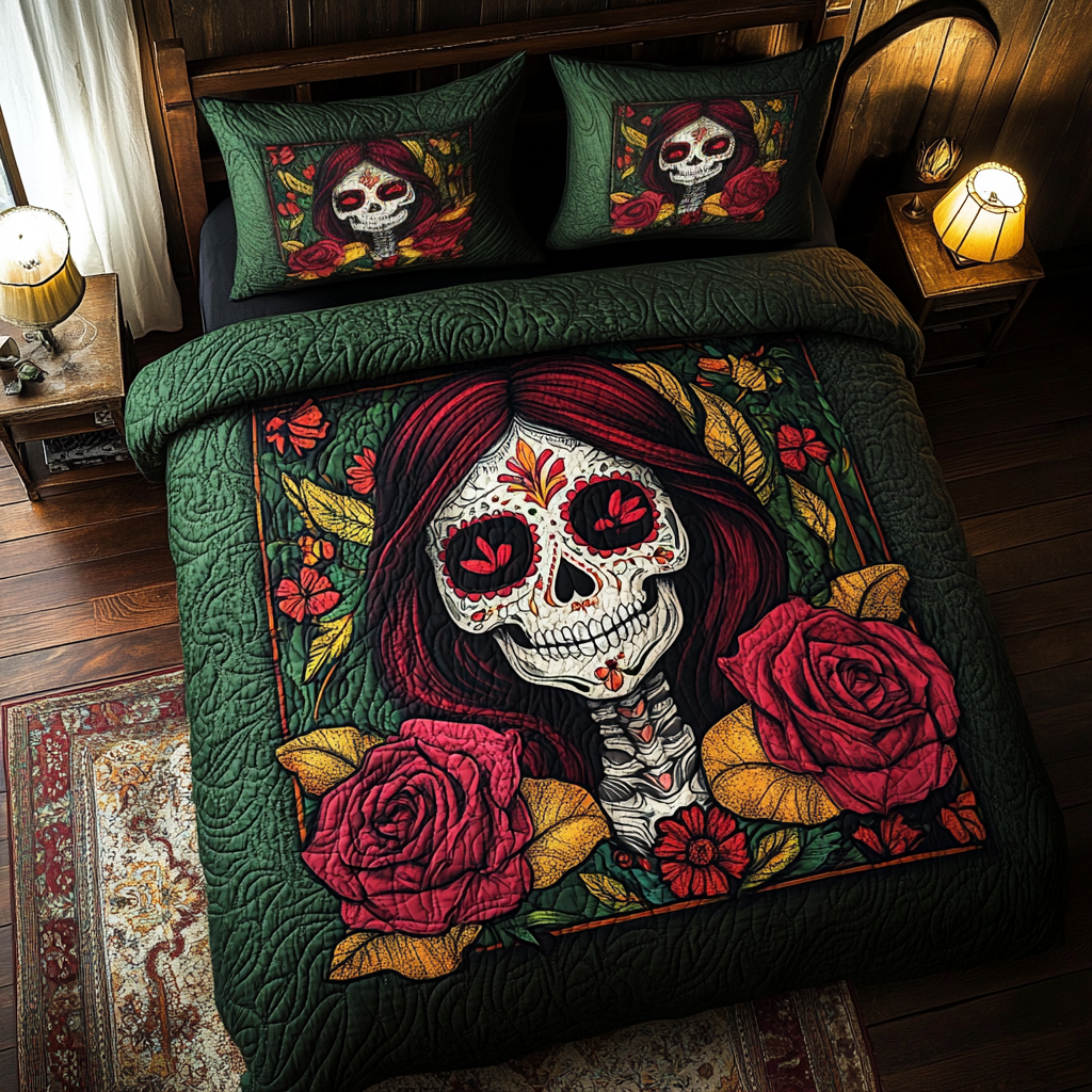 Festive Skull Flowers 3-Piece Quilted Bedding Set NCU0TL1931